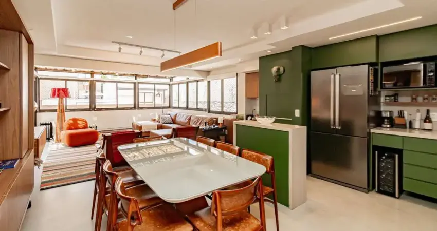 02 suítes, uma delas com closet, banheira, cozinha americana integrada com a sala de estar, lavado, churrasqueira, piscina na área externa ensolarada e 2 vagas de garagem.