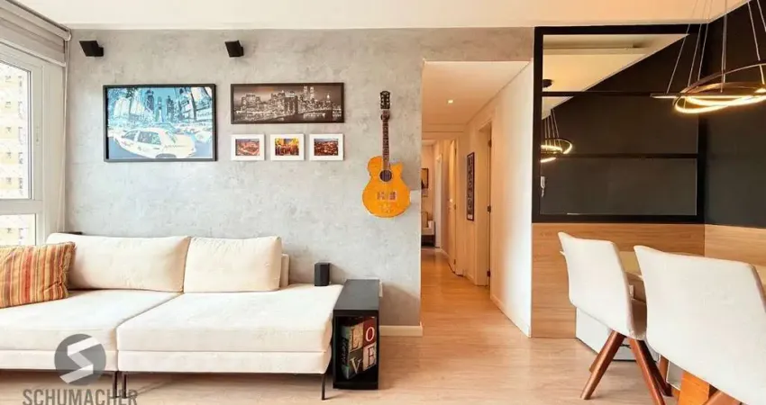 Apartamento de 2 dormitórios com suíte, sala ampla com 2 ambientes decorados, cozinha americana com churrasqueira, móveis planejados e área de serviço integrada. Banheiro com ventilação natural.