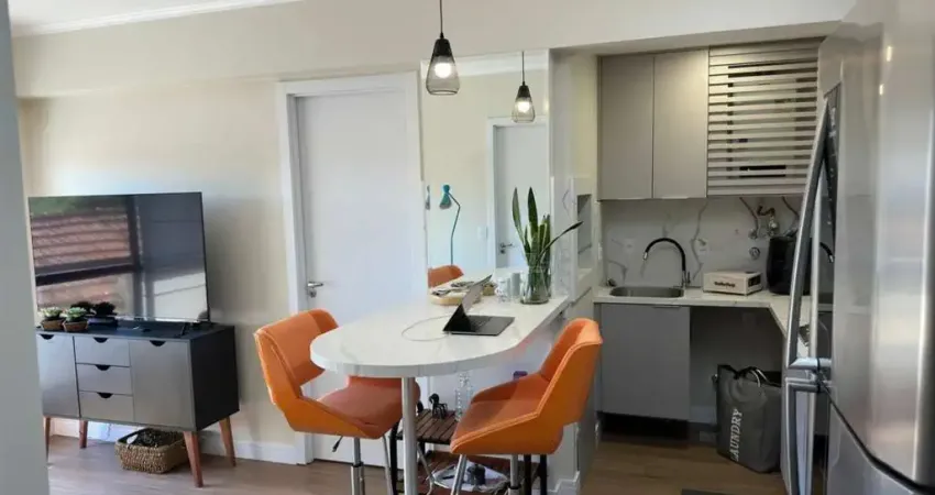 APTO com 2 suítes, sendo uma americana, living 2 ambientes, com sacada, cozinha com churrasqueira e área de serviço, está lindamente mobiliado todo sob medida, com mesa e roda banca de mármore, ficam todos os moveis fixos, luminárias, geladeira e Juncker, possui fechadura eletrônica.