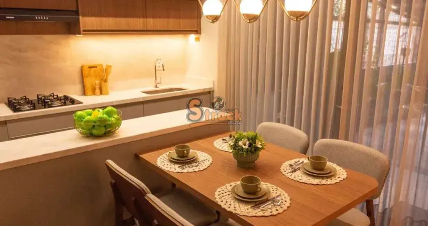 São 02 dormitórios + office, sendo 01 suíte, sala de estar e jantar integradas, cozinha, churrasqueira, 02 banheiros, com lavanderia coletiva, ferramentaria, playgrond, salão de festas/coworking, academia, piscina, bicicletário, espaço kids.