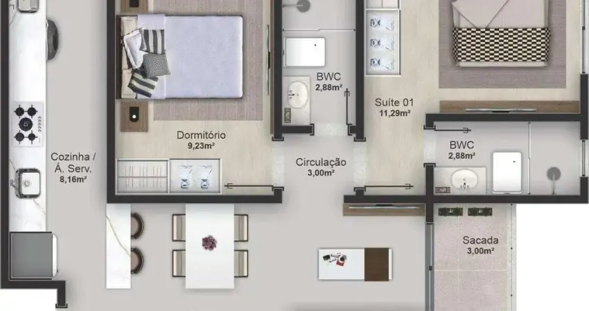 Este apartamento moderno foi projetado para oferecer conforto, praticidade e lazer completo. Com acabamento em gesso e piso em porcelanato, o imóvel conta com living integrado, sala de estar, sala de jantar, banheiro social, cozinha funcional e área de serviço, além de churrasqueira e sacada para momentos de lazer. A infraestrutura contempla espera para ar-condicionado split, infraestrutura para água quente, fechadura com senha na porta de entrada e medidores de água, luz e gás individuais, garantindo autonomia e segurança. O apartamento ainda oferece espera para carregador elétrico e garagem com pontos para carregador, pensando em conforto e mobilidade.