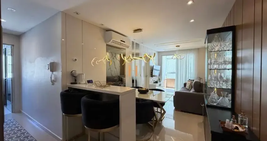 Apartamento dois dormitórios, sendo uma suíte, sala integrada à cozinha planejada, sacada com churrasqueira a carvão, banheiro social, ar condicionado, piso porcelanato e uma vaga de garagem privativa
