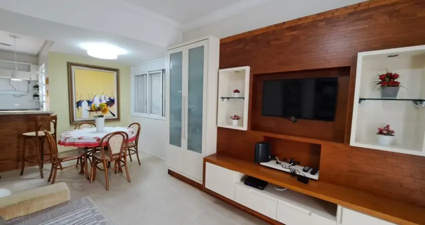 Apartamento à poucos metros da praia, com 2 dormitórios, sendo 1 suíte, banheiro social, sacada com churrasqueira, vista parcial pro mar, living, cozinha americana, área de serviço, semi mobiliado e 1 vaga de garagem.