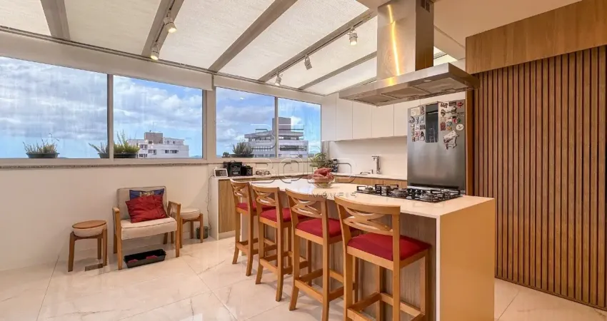 Com 123,77m² privativos e face norte, o imóvel conta com ampla sala integrada em três ambientes - estar, jantar e cozinha gourmet - proporcionando conforto e integração.