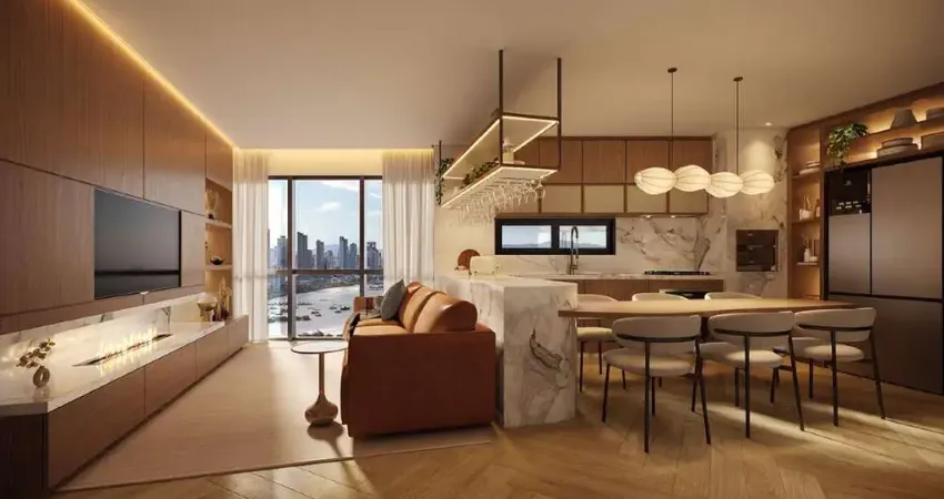 O living é integrado à cozinha americana, criando um ambiente moderno e funcional. A varanda com churrasqueira amplia o espaço de convivência e proporciona momentos agradáveis, valorizados pela vista panorâmica.