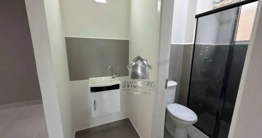 A cozinha e a lavanderia estão integradas em um único ambiente funcional, totalmente pintado na cor branca, com balcão de pia e tanque, oferecendo praticidade para o dia a dia. Todos os ambientes receberam revestimento em cerâmica London Grey retificada, que valoriza o imóvel com um acabamento moderno e de fácil manutenção.