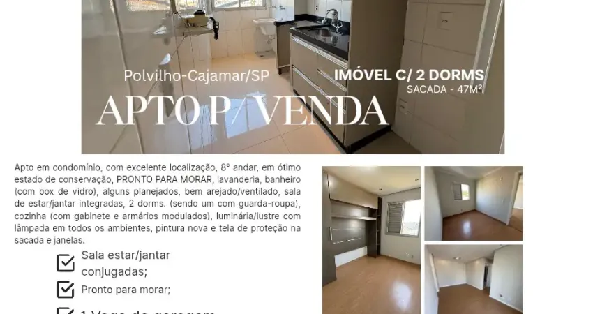 Apto de 2 dorms, pronto para morar, Polvilho, Cajamar/SP, Residencial Treviso, 47m², sacada e 1 vaga de garagem
