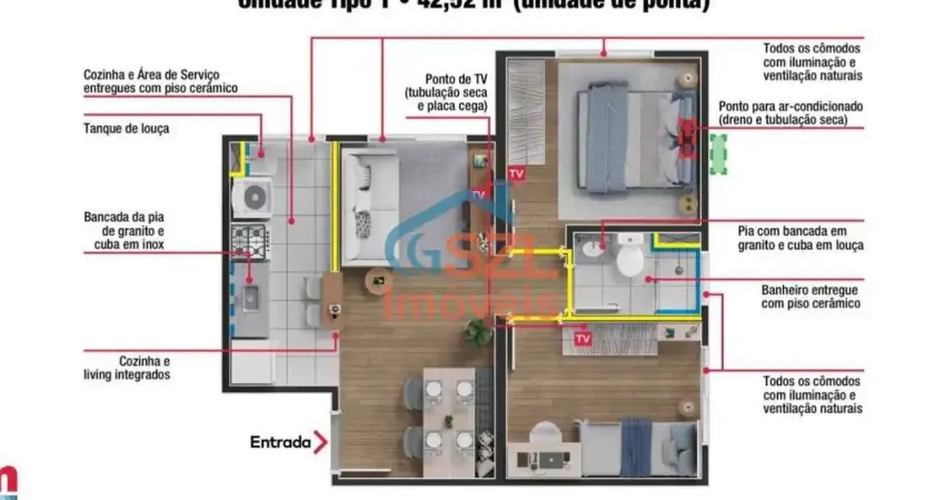 Apto novo, unidade localizada no 3° andar, com 43 mt2, 02 dormitórios, sala para dois ambientes, cozinha e área de serviço.