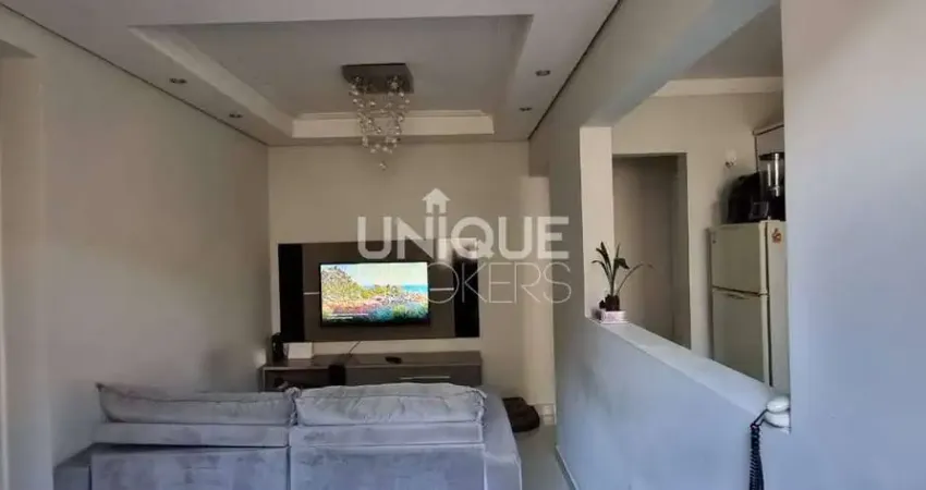 Sala ampla integrada à sala de jantar, 2 quartos,1 banheiro com box de vidro, Cozinha americana com armários planejados.