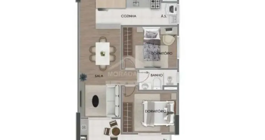 Com sala integrada, cozinha funcional, banheiro, área de serviço, sacada e 1 vaga de garagem.