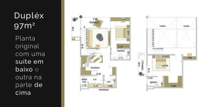 Apartamento com planta original de 97m², oferecendo um projeto inteligente e com grande potencial de personalização. O imóvel conta com a possibilidade de ampliação para aproximadamente 110m² por meio da transformação de um mezanino, o que proporcionaria uma sala ainda mais ampla e imponente. Outra opção é manter a sala no formato atual e criar uma terceira suíte no andar superior, agregando ainda mais valor e funcionalidade ao imóvel.