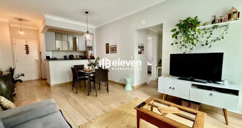 Apartamento seminovo, de frente, com excelente distribuição dos ambientes. O imóvel conta com 2 dormitórios, sendo 1 suíte, além de banheiro social. A sala para dois ambientes é integrada à sacada, proporcionando boa iluminação e ventilação natural.