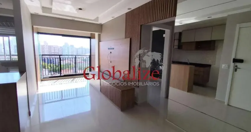 com 63m², 2 dormitórios, 1 suite, sala ampla, dois ambientes com armários planejados e varanda fechada.