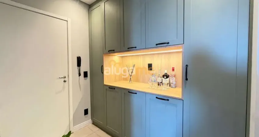 O apartamento possui uma cozinha americana com balcão de divisória para o ambiente da sala, rica em armários, com cooktop, e a sala possui uma parede com marcenaria do chão ao teto, e porta deslizante integrada a parede, 'escondendo' o acesso aos quartos. A sacada possui uma linda vista livre. São 02 dormitórios, ambos com armário embutido, e o banheiro também conta com um fino acabamento, box blindex, gabinete e armário aéreo espelhado.