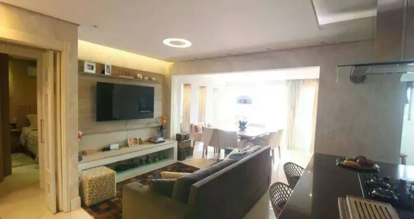 2 dormitórios com armários sendo 2 suítes, banheiro social, living integrado com sala para 3 ambientes, varanda com fechamento em vidro, lavabo, cozinha equipada com forno, cooktop e armários, área de serviço com armários e 2 vagas de garagem.