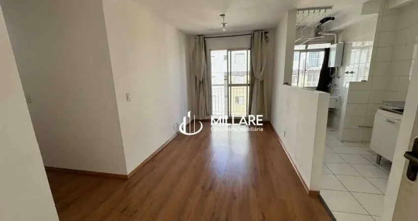 Apartamento com 48 m², 2 quartos, 1 banheiro, sala, cozinha americana, lavanderia e varanda.