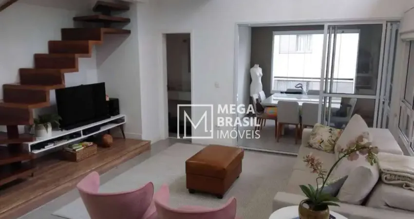 Apartamento Duplex com 120m² em alto acabamento, armários embutidos, porcelanato e carpete de madeira, 2 vagas de garagem e lazer completo.
