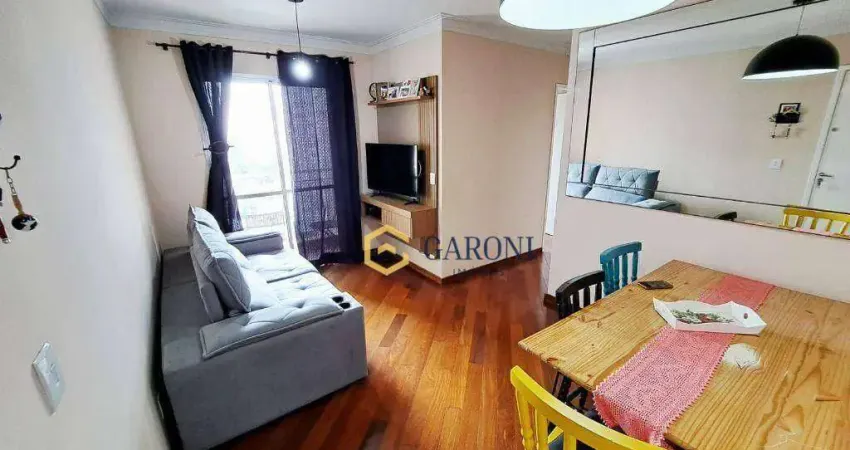 Andar alto, com 48m de área útil, 2 quartos com guarda-roupas, piso laminado, sala 2 ambientes com sacada vista livre, mesa de madeira com 4 cadeiras, painel para tv, sofá, cozinha com armários, cooktop com forno, geladeira, forno elétrico, área de serviço com armário, aquecedor, tanque e máquina de lavar roupas, banheiro social com gabinete e box de vidro, 1 vaga coberta indeterminada (sorteio 2 em 2 anos).