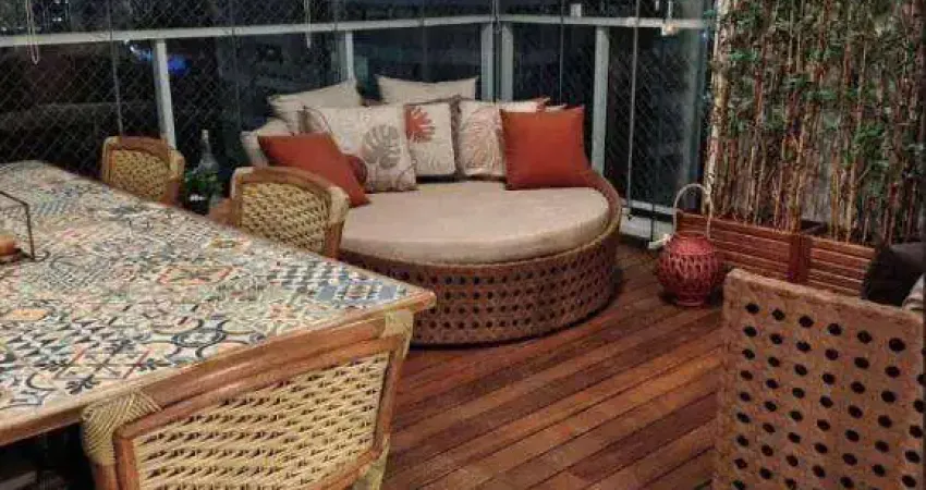 2 suítes, lavabo, sala de estar e jantar integradas, ampla varanda gourmet com fechamento em vidro e grill de pedras vulcânicas, cozinha equipada, lavanderia e 2 vagas de garagem.