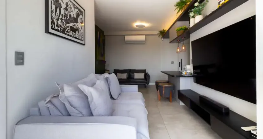Sala integrada à varanda nivelada e envidraçada, criando um espaço amplo e sofisticado