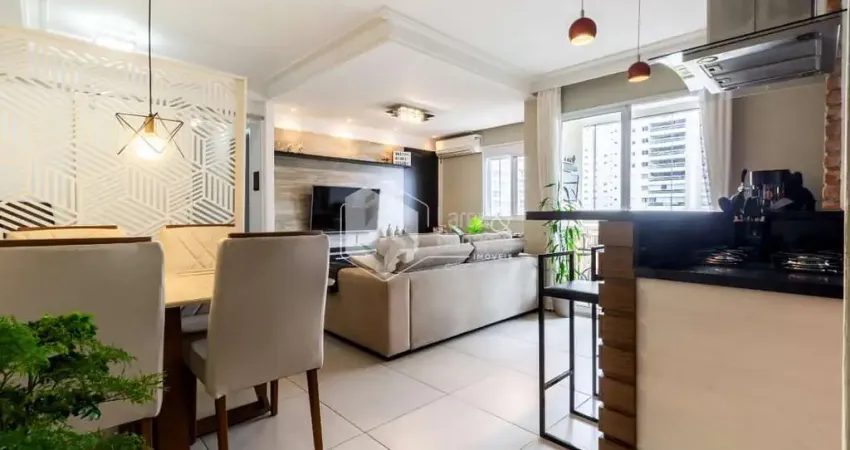 São 2 dormitórios, sendo 1 suíte, sendo 2 banheiros no total. O apartamento conta com ar-condicionado na sala e armários planejados de excelente qualidade na cozinha, nos banheiros e nos dormitórios, oferecendo praticidade, organização e um visual sofisticado. - Ah, também temos um armário embutido de apoio no hall de entrada do apartamento.