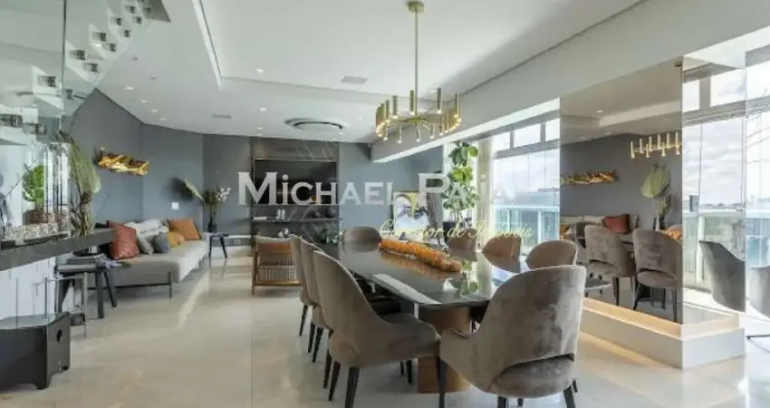Suíte principal, vista panorâmica, closet, home office, banheira, pias e chuveiros duplos.