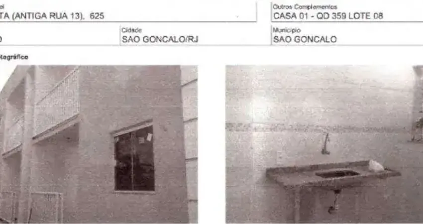 2 Quartos, Área de Serviço, Wc, Sala, Cozinha. RUA SOUZA COSTA,N. 625 CS 01, BOM RETIRO - CEP: 24726-136, SAO GONCALO - RIO DE JANEIRO**