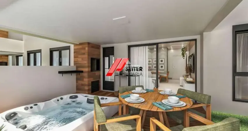 São 119,74m² de área privativa interna + 25m² de área externa exclusiva, com churrasqueira e spa. O apartamento possui 2 dormitórios (sendo 1 suíte), sala ampla e iluminada com vista para o mar, cozinha moderna e integrada, além de 2 vagas de garagem e 1 hobby box . A posição solar norte garante ótima iluminação natural durante o ano todo.