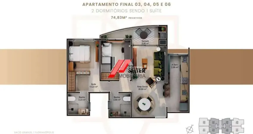 Apartamento com 2 dormitórios, sendo 1 suíte, com 74,83 m2 de área privativa. Conta com 1 vaga de garagem e Hobby Box. Este apartamento oferece acabamento de alto padrão com piso porcelanato, persianas nos dormitórios e sacada com churrasqueira. O condomínio dispõe de piscina, salão de festas, espaço fitness, playground e bicicletário. Localização estratégica na SC-401, com fácil acesso ao centro e às praias.