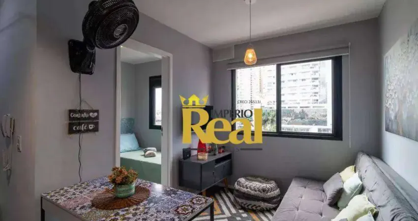 Apartamento mobiliado à venda em São Paulo, com 34 m² de área útil. Possui 2 dormitórios, banheiro com box e chuveiro a gás, cozinha americana equipada (geladeira inclusa) e área de serviço. O imóvel conta com armários planejados e está localizado em andar baixo. Não possui vaga de garagem.