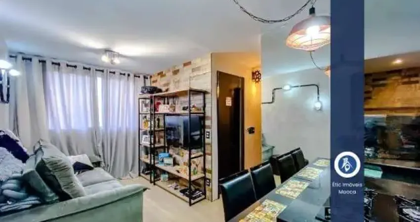 Apartamento no Brás, 45m2, 2 dormitórios com armários, sala para dois ambientes, cozinha americana com armários planejados, área de serviço e banheiro.