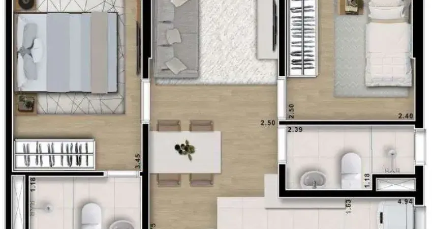 • Apartamento de 42m² com 2 dormitórios, sendo 1 suíte, e sacada