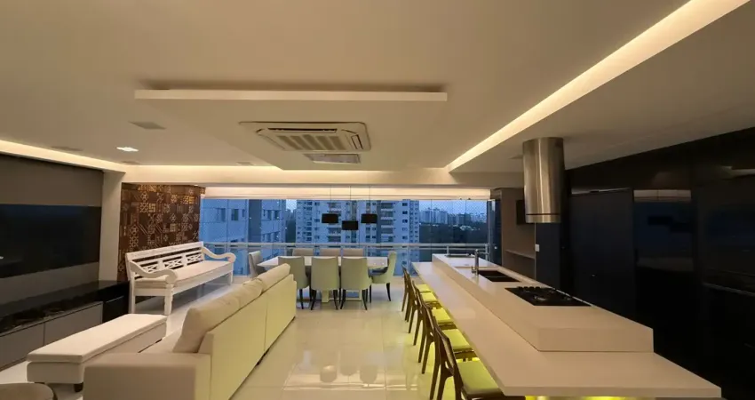 3 suítes, sendo a master com closet, sala com varanda incorporada, cozinha em ilha, área de serviço e banheiro social.