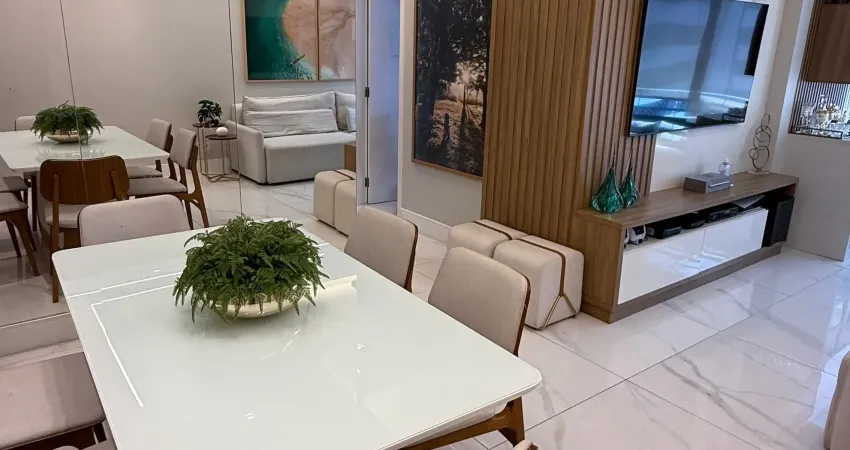 São 3/4 sendo uma suite, varanda incorporada à sala, banheiro social e de serviço, andar alto, 2 vagas de garagem armários em todos os ambientes, ar condicionado, 80m2, portaria 24h