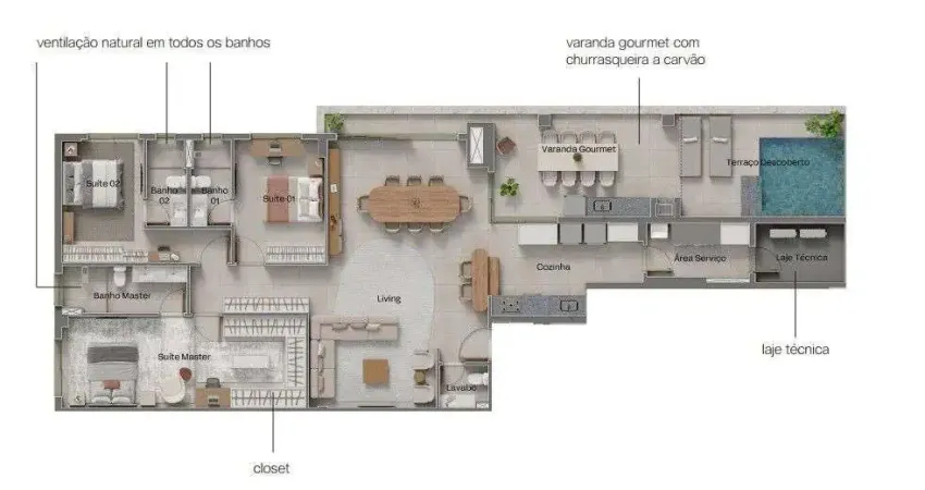 Esta cobertura duplex de 193 m² contará com 3 suítes (sendo a master com box duplo para chuveiros), sala ampla integrada à varanda gourmet com churrasqueira a carvão, lavabo, área de serviço com espaços cobertos e descobertos, além de um terraço descoberto pronto para receber piscina. Serão 3 vagas de garagem, elevando ainda mais a praticidade.