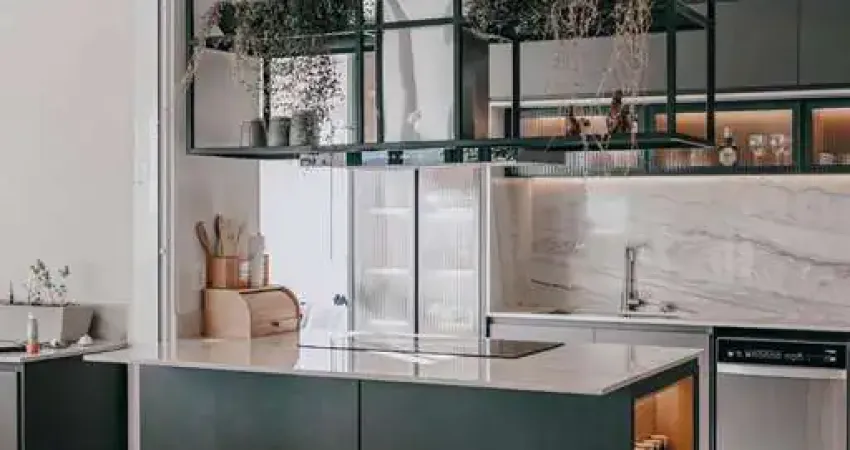 125 m2 3 suítes plenas com armários Sala para 02 ambientes Varanda gourmet Cozinha americana com ilha Área de serviço com armários Despensa 2 vagas paralelas Andar alto