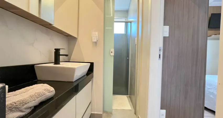 Banheiro social com excelente acabamento, armário, espelho e box.