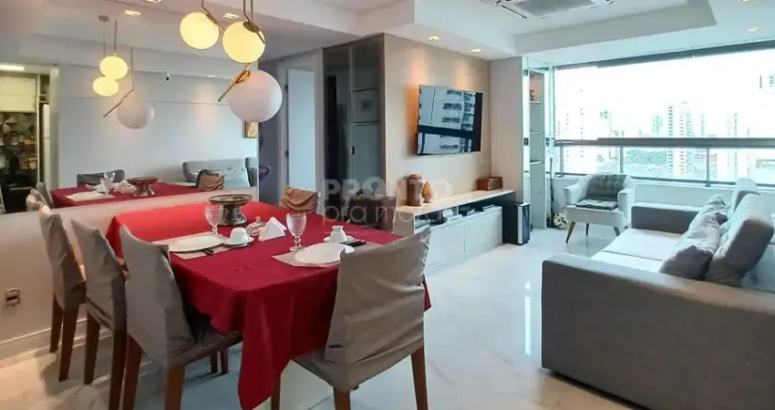 O imóvel possui varanda integrada com a sala, sala para dois ambientes, três quartos sendo um suíte com closet, banheiro social, cozinha, quarto e banheiro de serviço, área de serviço e duas vagas de garagem cobertas.