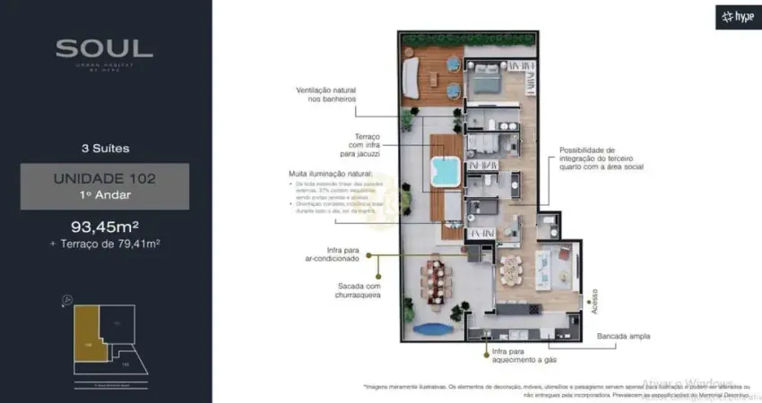 Esta luxuosa unidade conta com um espaço amplo de 93,45m2, divididos em 3 suítes espaçosas, 1 sala ampla de dois ambientes sendo sala de estar e sala de jantar, com uma cozinha separada com um espaço ideal para uma melhor mobilidade e comodidade entre os ambientes, além da área de serviço, a unidade ainda conta com um espaço reservado para o bem estar e o lazer familiar, um terraço com uma área de 79,41m2 com infraestrutura para Jacuzzi, pronto para ser decorado de acordo com seu gosto e preferência