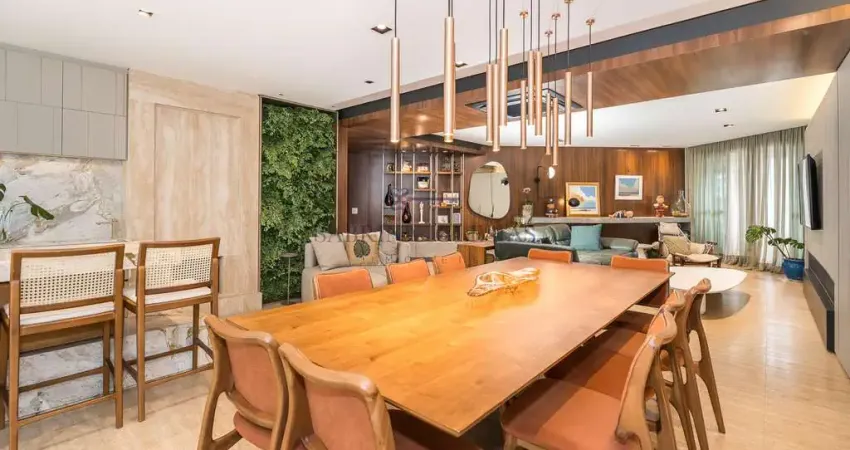 A área social é ampla, integrada e extremamente agradável. Os ambientes conversam entre si com naturalidade, valorizados pela marcenaria sob medida, pela paleta neutra com madeira e pela iluminação bem resolvida, que deixa tudo mais leve e convidativo. As varandas envidraçadas ampliam o espaço e funcionam como uma extensão da sala, perfeitas para o dia a dia e para receber.