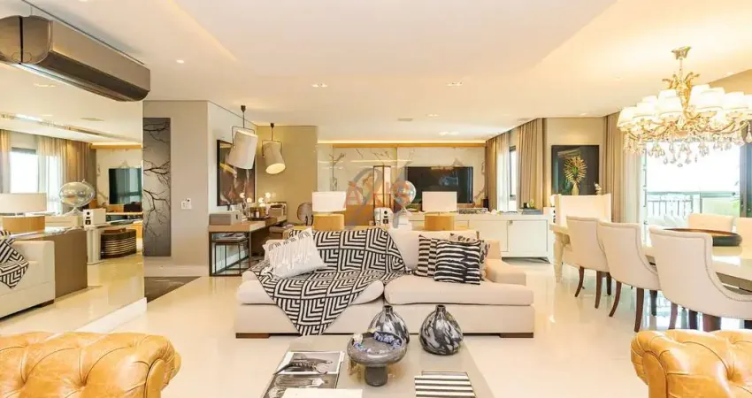 Com 244 m² de área privativa, o apartamento oferece ambientes amplos, integrados e com excelente iluminação e ventilação natural. O hall de entrada com elevador privativo reforça a exclusividade do imóvel. A área social conta com sala para três ambientes, lareira, adega e integração com o espaço gourmet com churrasqueira a carvão, além de sacada com vista panorâmica.