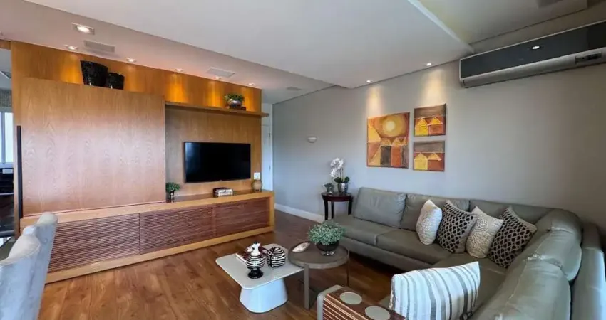 Apartamento de 133 m² com 3 suítes e 2 vagas, onde o acabamento e a ambientação deixam claro o padrão acima da média. A área social é o grande destaque: living amplo e integrado, com piso amadeirado e uma marcenaria de impacto no painel da TV madeira clara com portas ripadas e nichos iluminados, trazendo sofisticação sem pesar. A sala entrega conforto real com sofá em L e composição neutra, e ganha ainda mais sensação de amplitude com parede espelhada (piso ao teto) valorizando luz e profundidade.