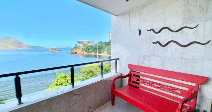 Apartamento frente mar, reformado por arquiteto, todo montado, unidade para cliente exigentes! Sala em dois ambientes, com móveis em design assinado, como mesa e cadeiras, poltronas e banquetas. São 3 quartos, com lavado, cozinha integrada com a sala e dependência de serviço com banheiro e máquina lava e (link removido) cozinha ficam o cooktop por indução, forno e microondas embutidos, coifa e geladeira side by side. Suíte master com 35m², toda montada com armários e banheira hidromassagem. Ficam todos os móveis do apartamento, retirada apenas de pequenos objetos e coisas pessoais. O imóvel já está desocupado! Esse apartamento conta com duas vagas na garagem! Raridade em Niterói! Agende sua agora sua visita!