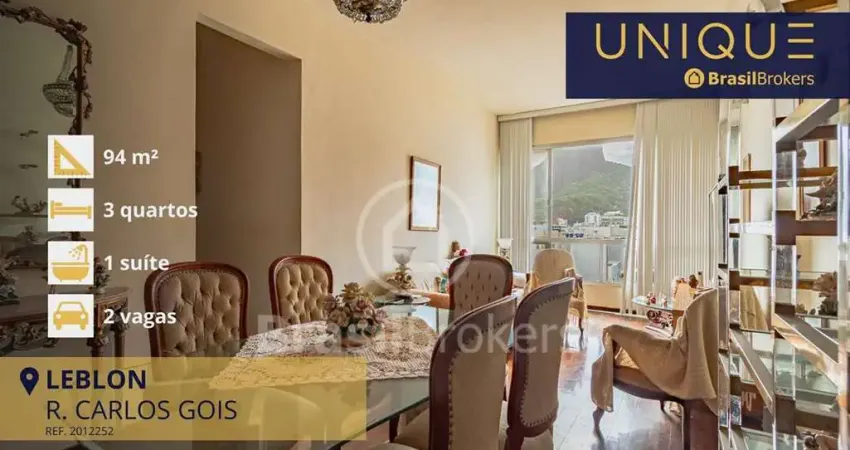 Atenção Apartamento na segunda quadra do Leblon Descubra este belíssimo apartamento de 3 quartos sendo 1 suíte com localização privilegiada na segunda quadra da praia da Rua Carlos Góis. Desfrute de amplos 94m de área útil com sala cozinha funcional área de serviço e dependências completas. O imóvel conta com 2 vagas de garagem na escritura e portaria 24 horas para sua segurança e conforto. Localizado no 9° andar este apartamento oferece uma vista livre e agradável de todos os cômodos. Portaria com funcionamento 24 horas. Não perca a chance de morar em um dos bairros mais desejados do Rio de Janeiro. Agende agora mesmo sua visita e realize o sonho de viver no Leblon - COD 2012252 - Informações Atualizadas em Treze de fevereiro Dois Mil e Vinte e Seis