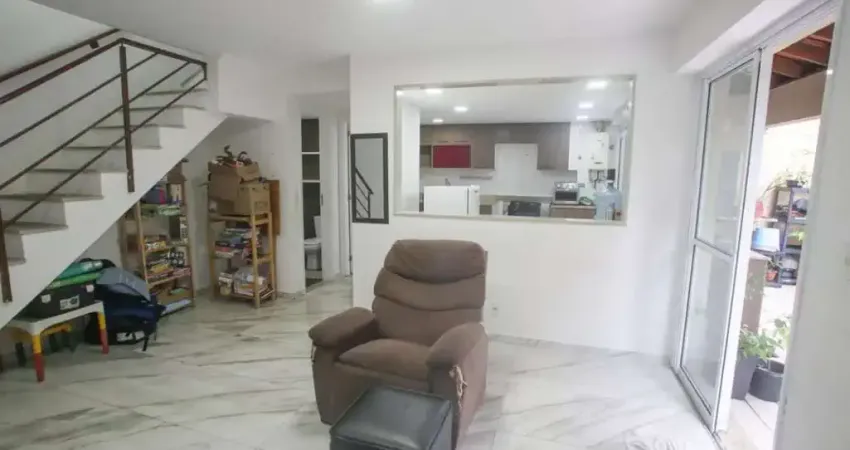 Apartamento duplex a venda (tipo casa de 2 andares) de 3 quartos com quintal mais privado do condomínio. 3 quartos no piso superior, 1 suíte, 3 banheiros, cozinha ampla com armários e água quente na pia.