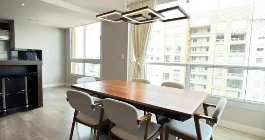 Ampla sala de estar e jantar integrados com sacada e cozinha, conceito aberto, totalmente mobiliada e equipada, churrasqueira, área de serviço separada, hall de entrada e 2 vagas de garagem.
