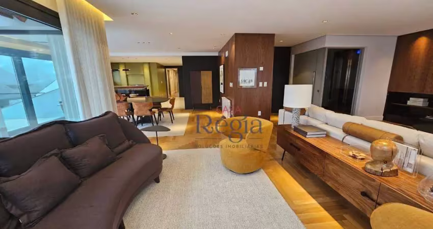 Possuindo 03 amplas suítes, lavabo, amplo living 02 ambientes com lareira, sala de jantar, cozinha integrada com churrasqueira, amplo terraço com vista permanente, esquadrias termo-acústicas com vidros duplos, automação elétrica, isolamento acústico entre pisos, portas internas com dobradiças de fechamento automático, 03 vagas de garagem e estacionamento para visitantes.
