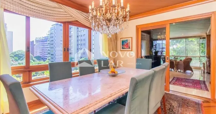 Imóvel semimobiliado com 270 m², sendo 3 suítes, dormitório do casal com closet e hidromassagem, amplo living para 3 ambientes, ante sala com sacada separada, lavabo, sacada grande com churrasqueira e linda vista panorâmica e definida, lareira, ensolarado, ventilado, banheiro social, cozinha planejada, área de serviço, dependência de empregada, ar central, entrada de serviço e 3 garagens individuais cobertas