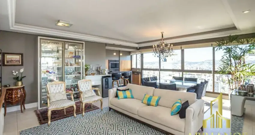 Apartamento semimobiliado com 132,8 m2 em andar alto, privilegiado por luz natural abundante. A área íntima conta com três dormitórios, incluindo uma suíte. O living amplo para três ambientes integra lareira e espaço gourmet com churrasqueira. A planta inclui lavabo, rouparia, cozinha, área de serviço e dependência de serviço completa. Dispõe de três vagas de garagem. Situado na parte alta do Bela Vista, o condomínio oferece infraestrutura de lazer com piscina aquecida, fitness, playground, salão de festas e churrasqueira, além de portaria 24 horas, elevador, gás central, interfone e medições individuais de água e gás. Uma oportunidade de viver com conforto, praticidade e excelente qualidade de vida. Preço e disponibilidade do imóvel sujeitos a alteração sem aviso prévio.