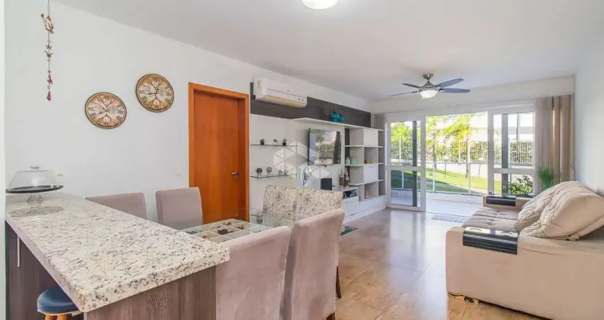Apartamento garden semimobiliado com 110m² (sendo 90m² internos e 20m² de área externa). São 3 dormitórios, incluindo 1 suíte, living amplo e cozinha americana com churrasqueira. Ficam os móveis fixos e os splits.